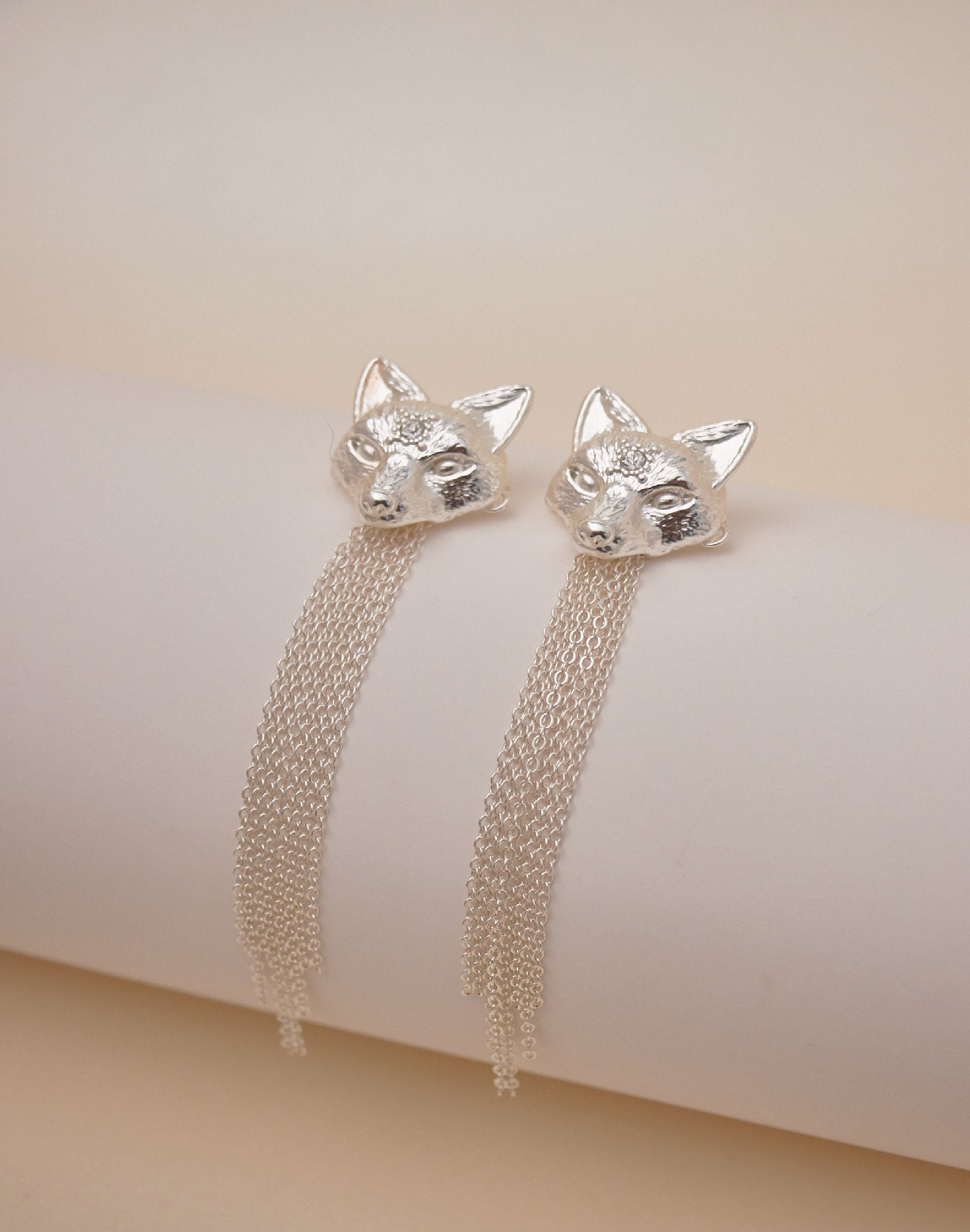 Pendientes Wolf Atrévete a brillar con estos pendientes que traen autenticidad tu look. Una cara de lobo cuidadosamente detallada con cadenas que cuelgan, creando un efecto dinámico y cautivador. Para quienes saben que los mejores accesorios son aquellos que cuentan una historia.