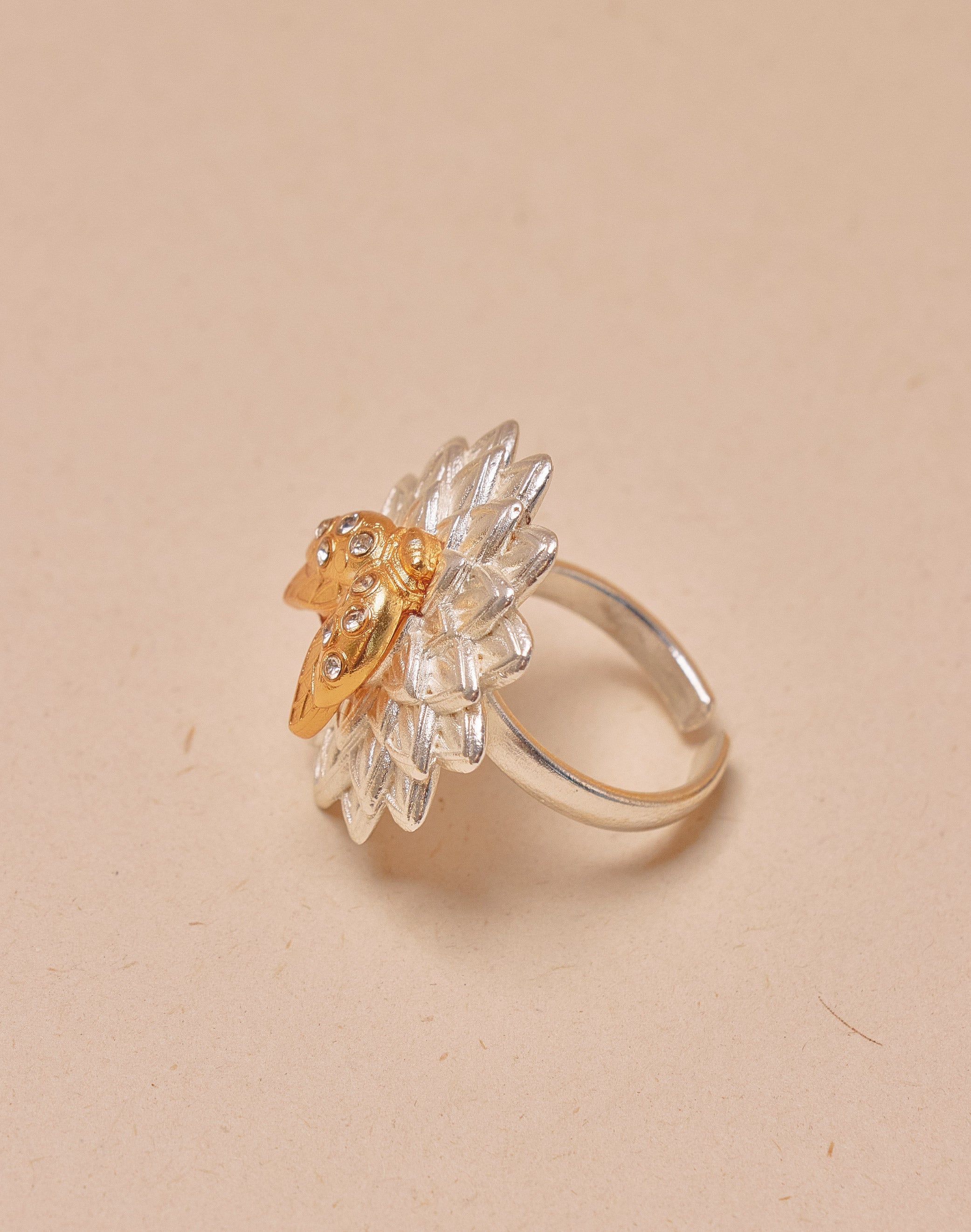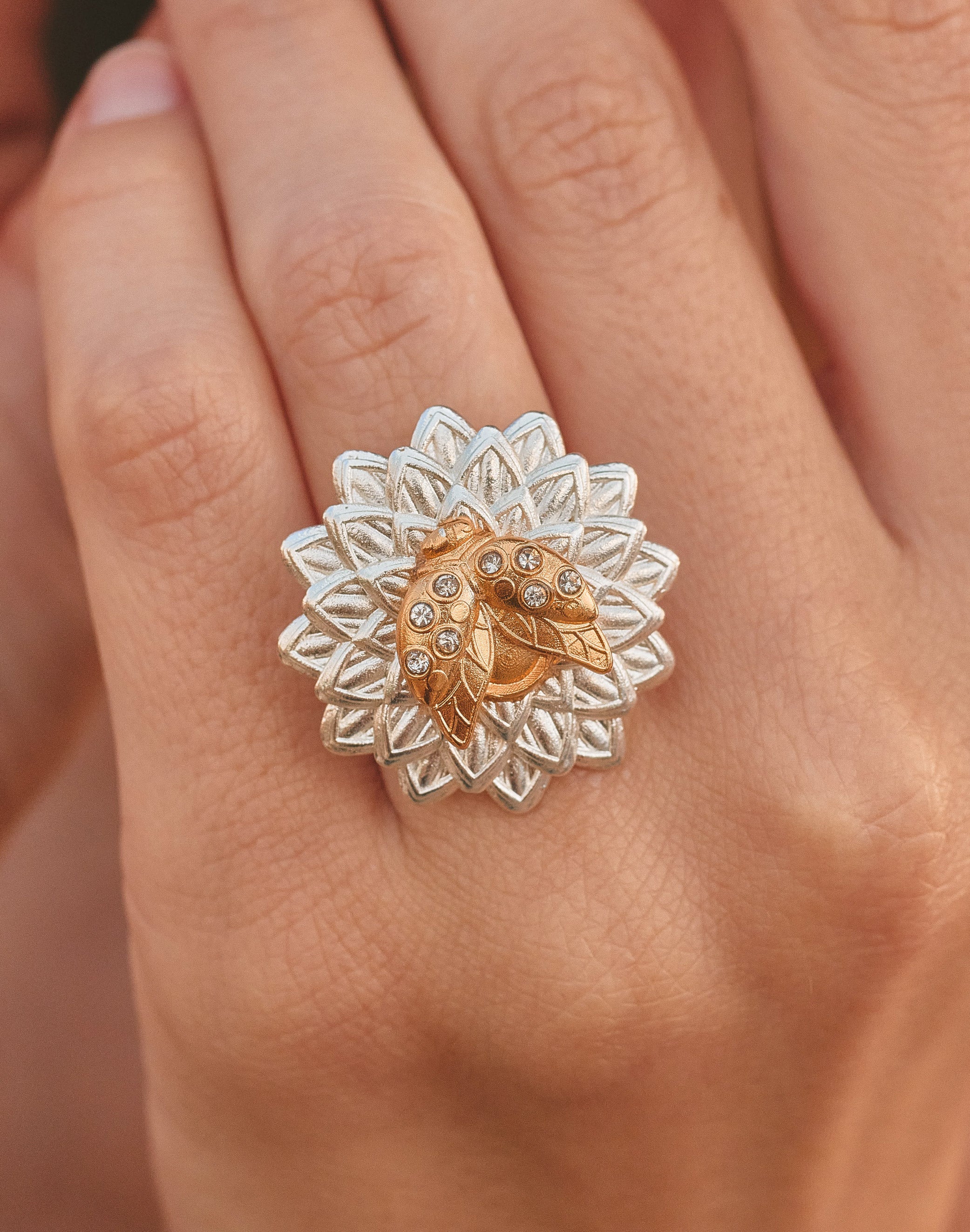 El crisantemo florece mientras la mariquita se posa en el centro como pequeño amuleto del jardín. Protectora silenciosa, mantiene el equilibrio natural y nos recuerda que las heroínas más poderosas son también las más diminutas. Diseño mix and match en plata y oro.