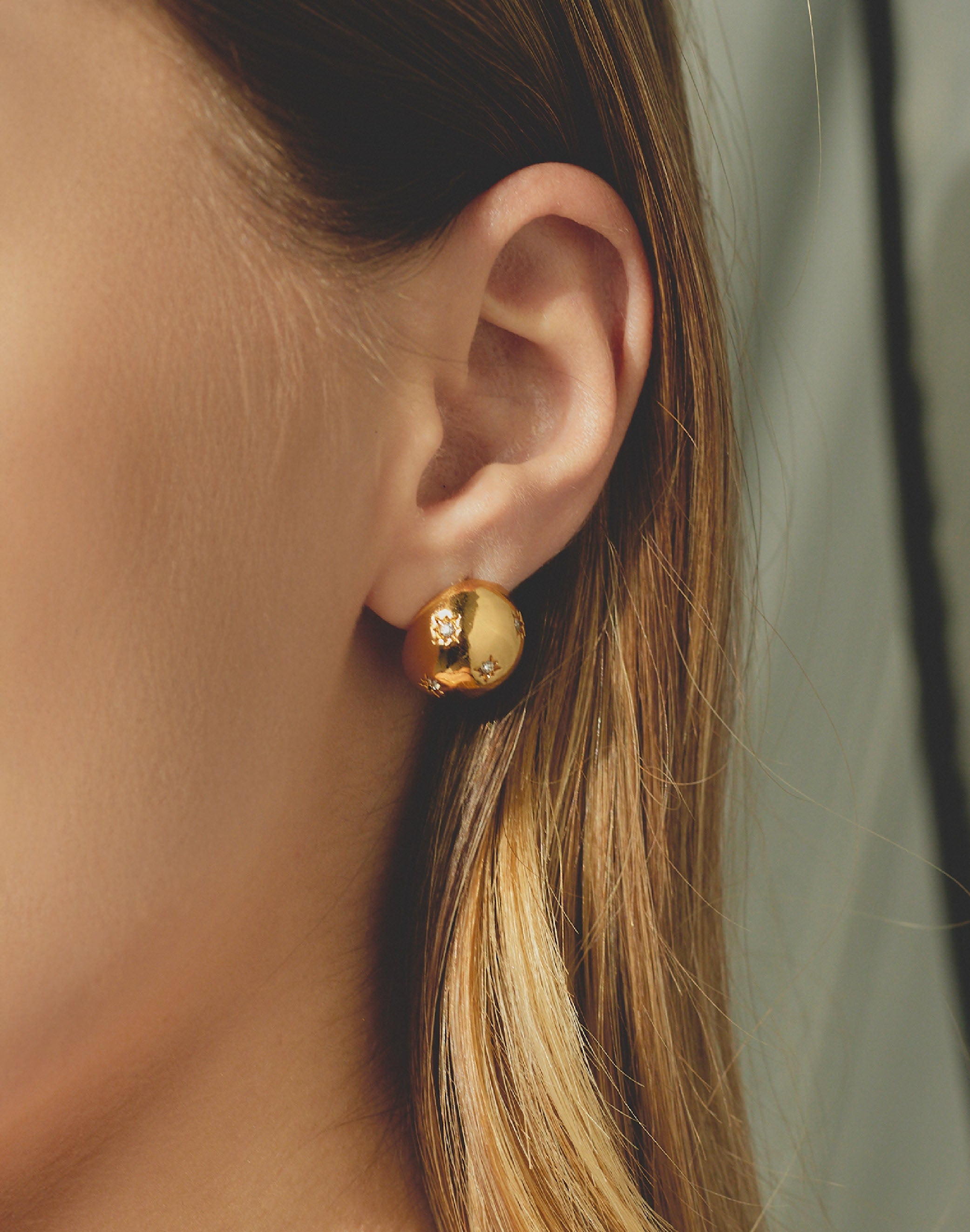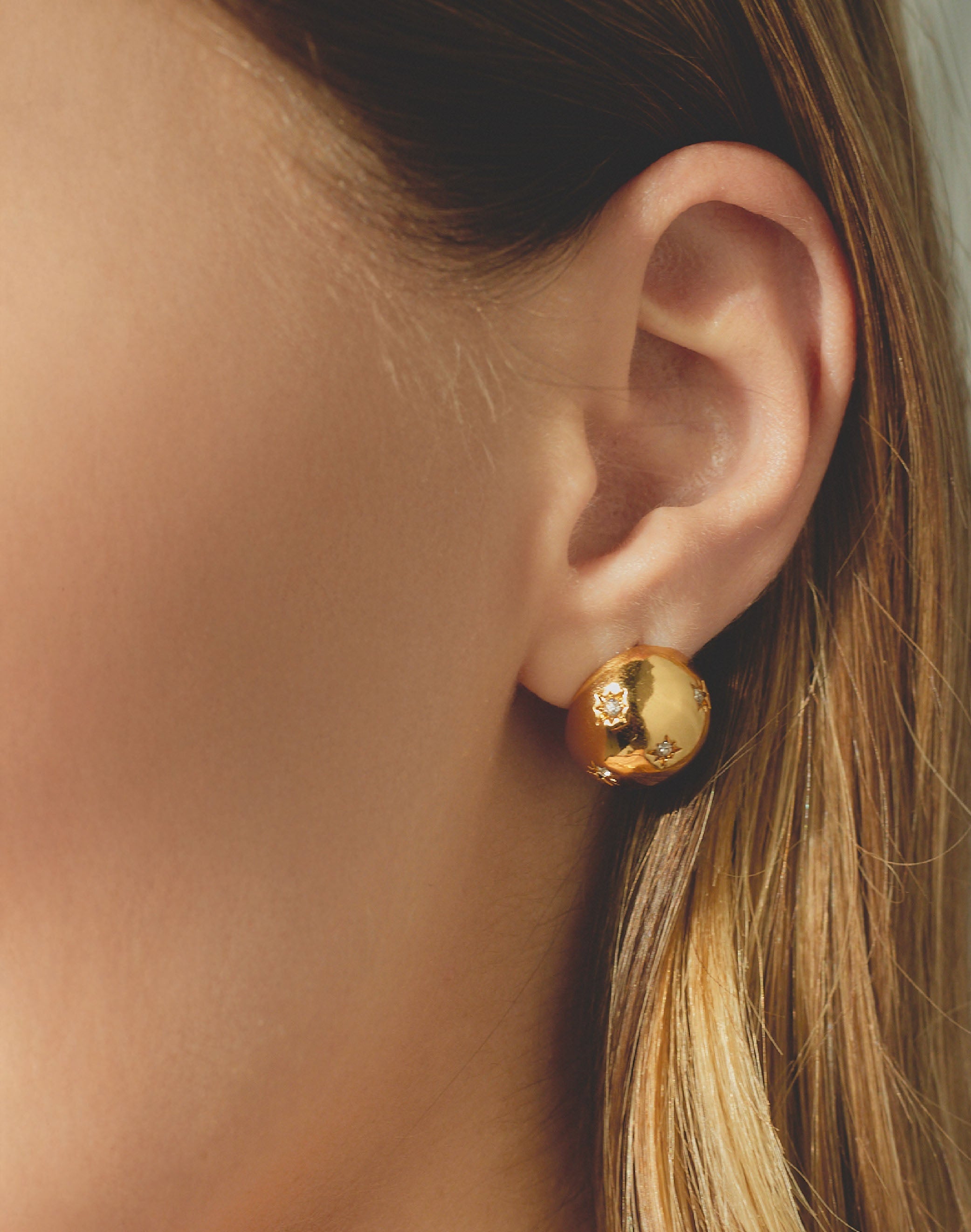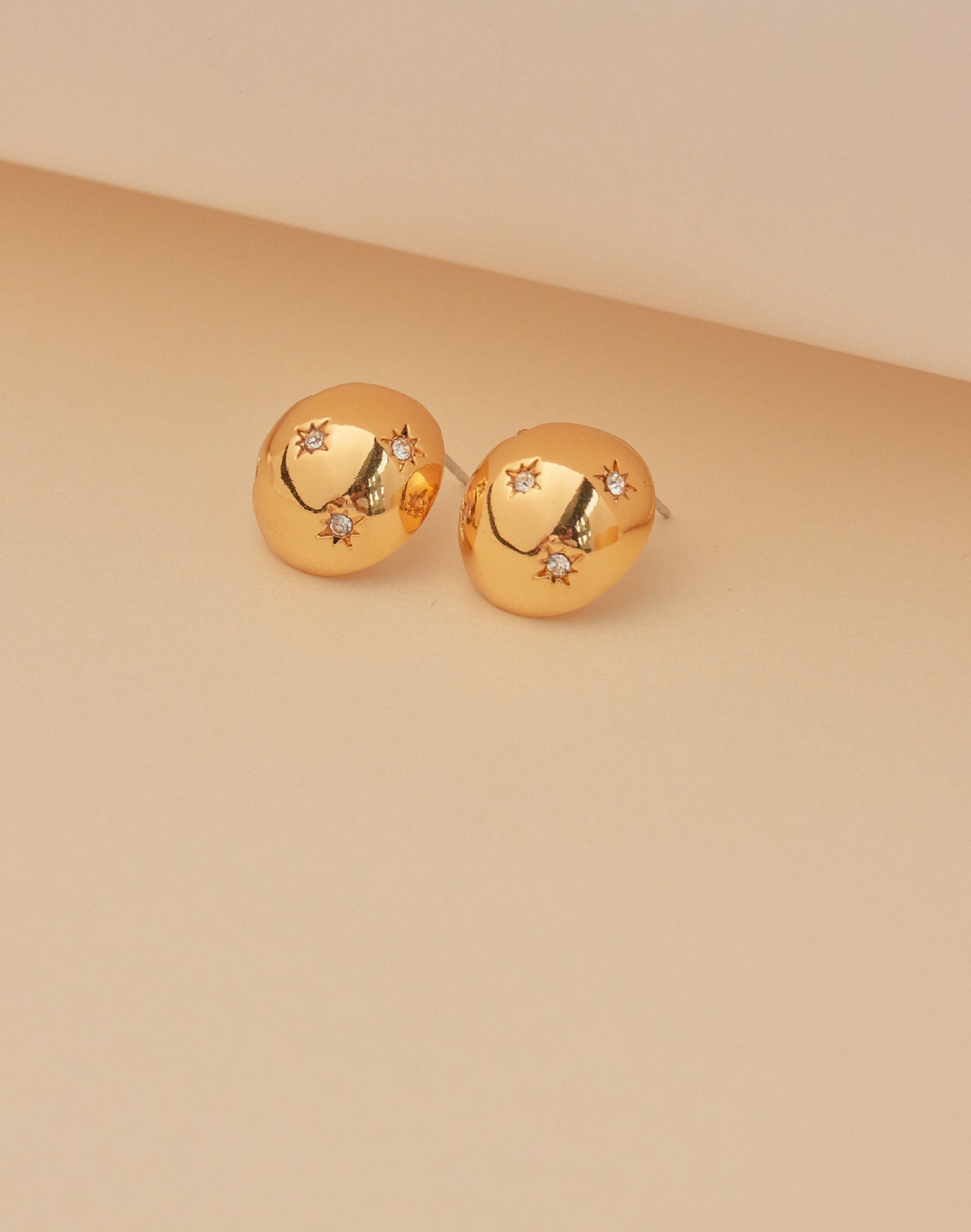 Dale un toque brillante a tu look con estos aretes en forma de media esfera. Sus cristales clear incrustados capturan la luz para que deslices destellos cada vez que muevas la cabeza. Perfectos para cualquier ocasión en la que quieras destacar.