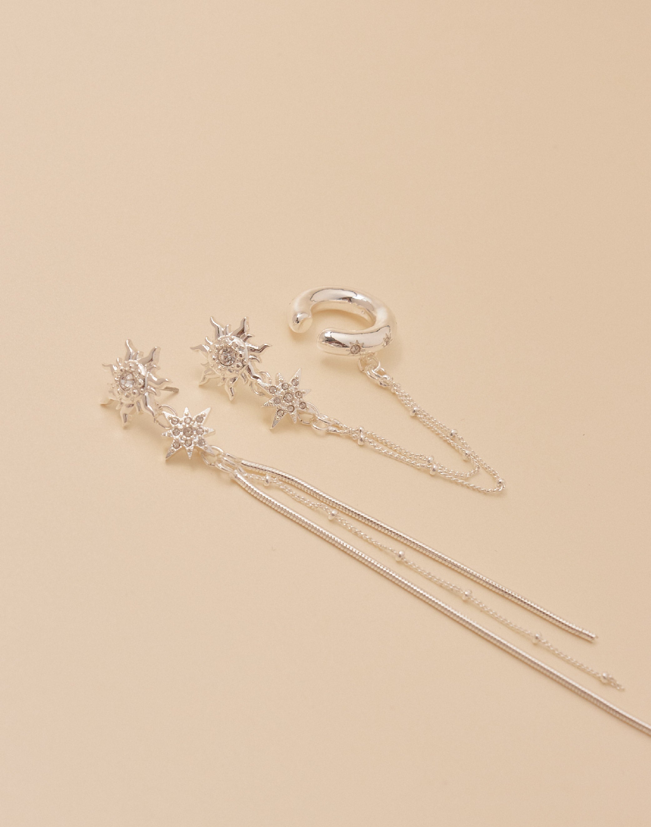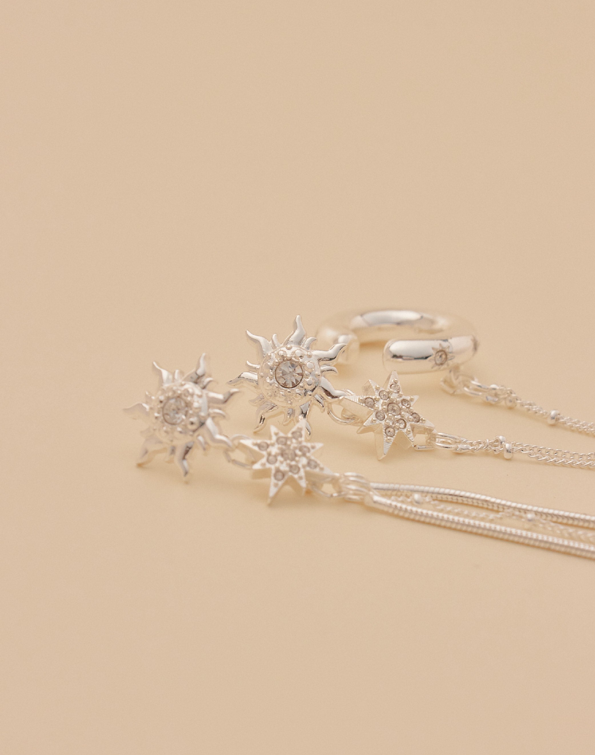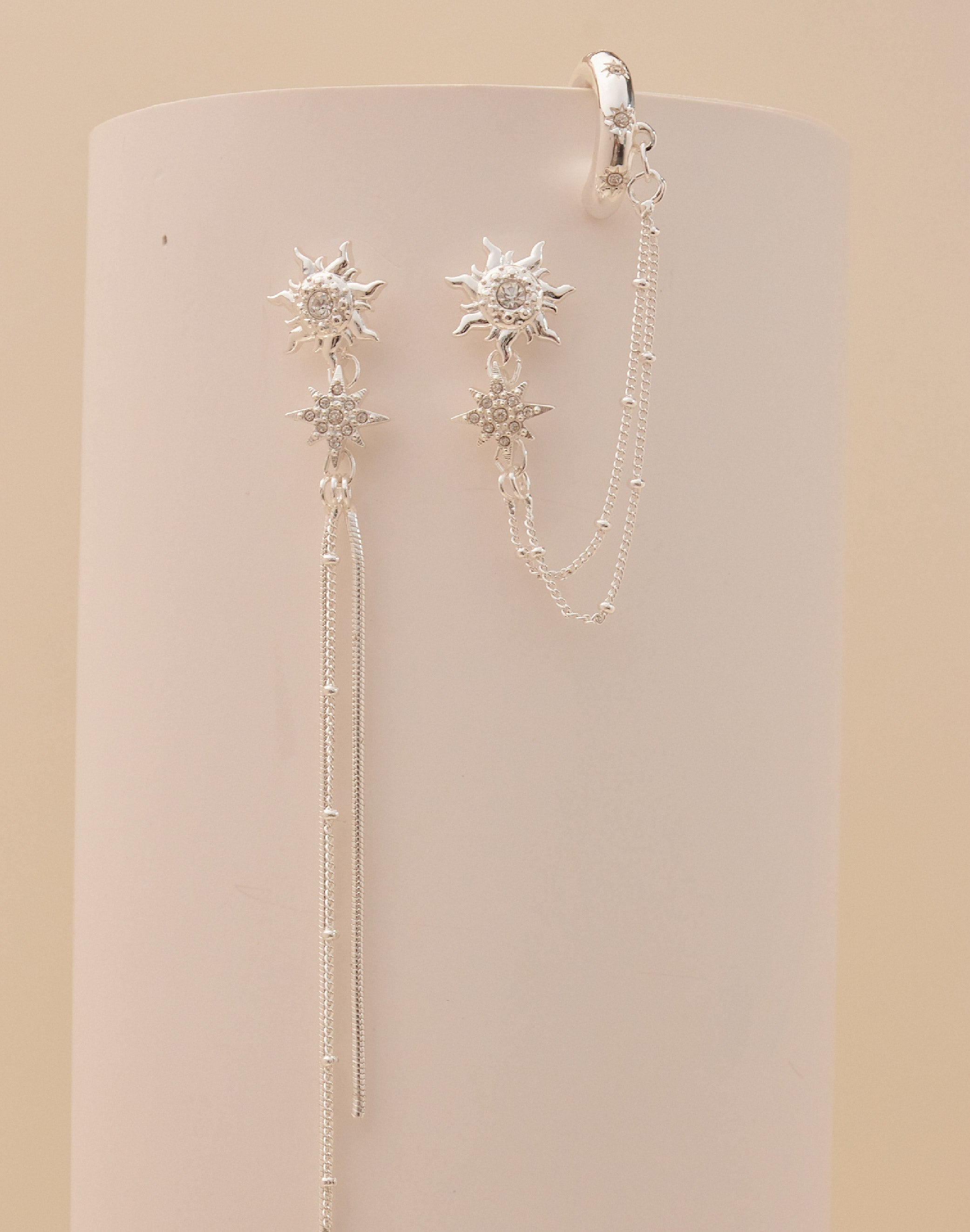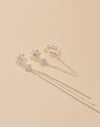 Descubre los Aretes Sunlight, un par asimétrico que ilumina tu look con detalle y originalidad. Una pieza combina un earcuff unido a una delicada cadena, mientras que la otra deja caer la cadena como un pendiente fluido. Perfectos para quienes aman el estilo único que atrae todas las miradas.