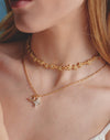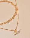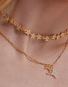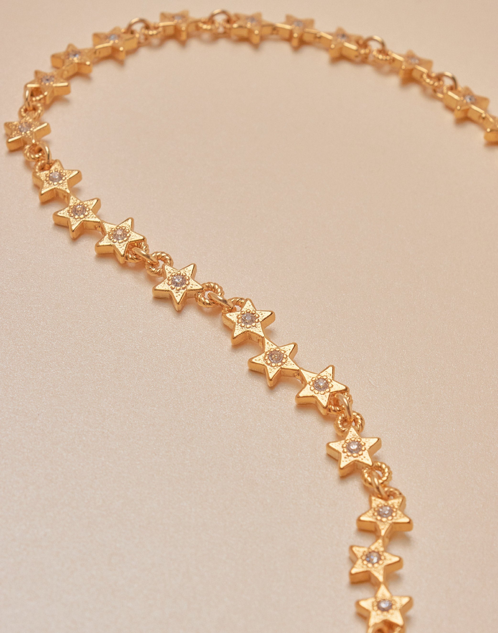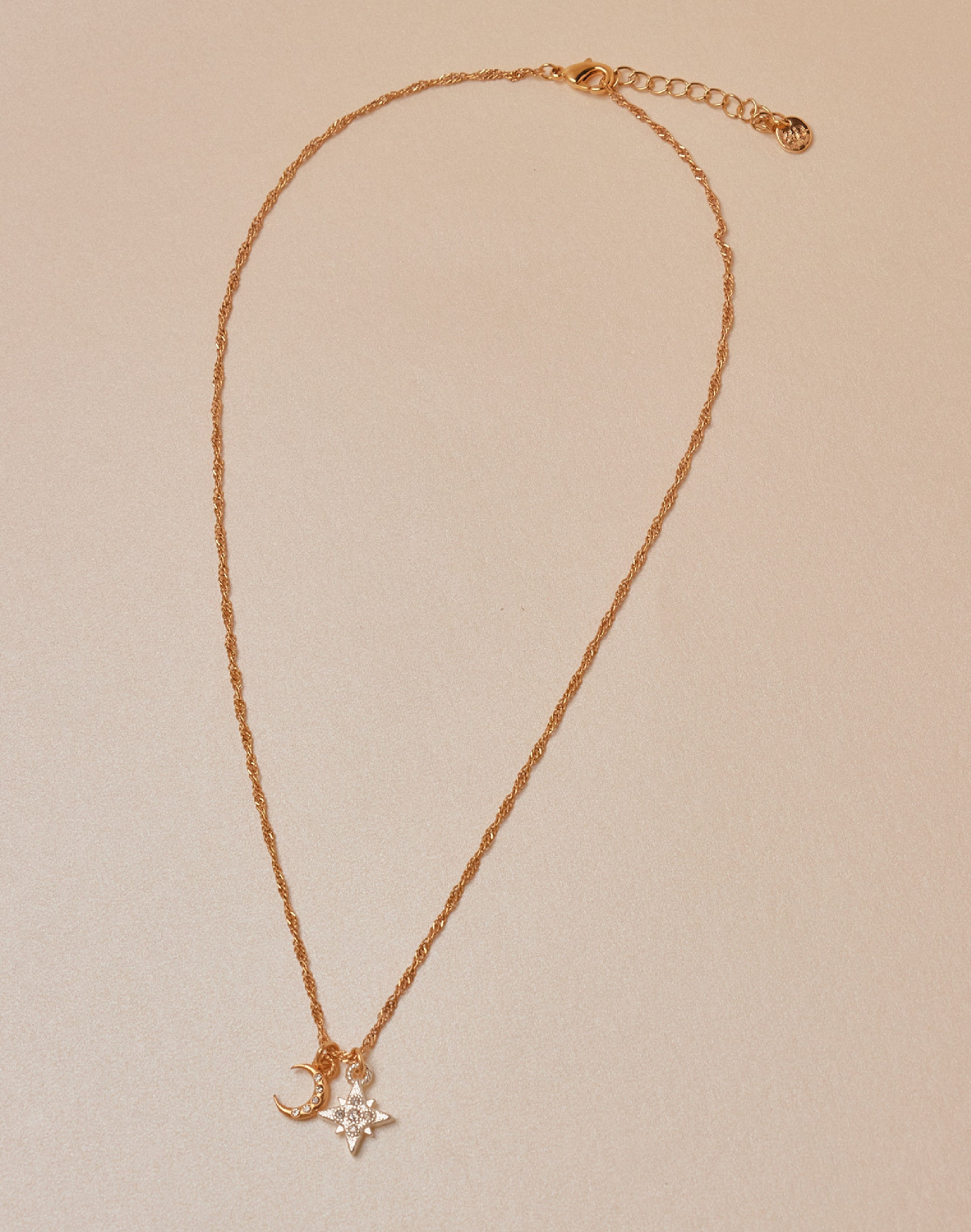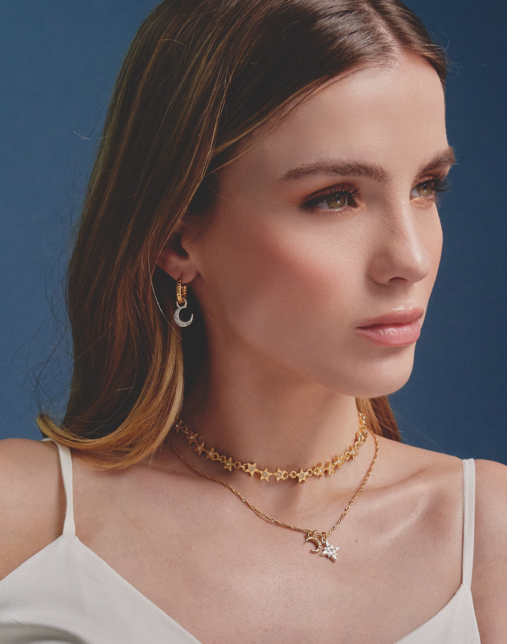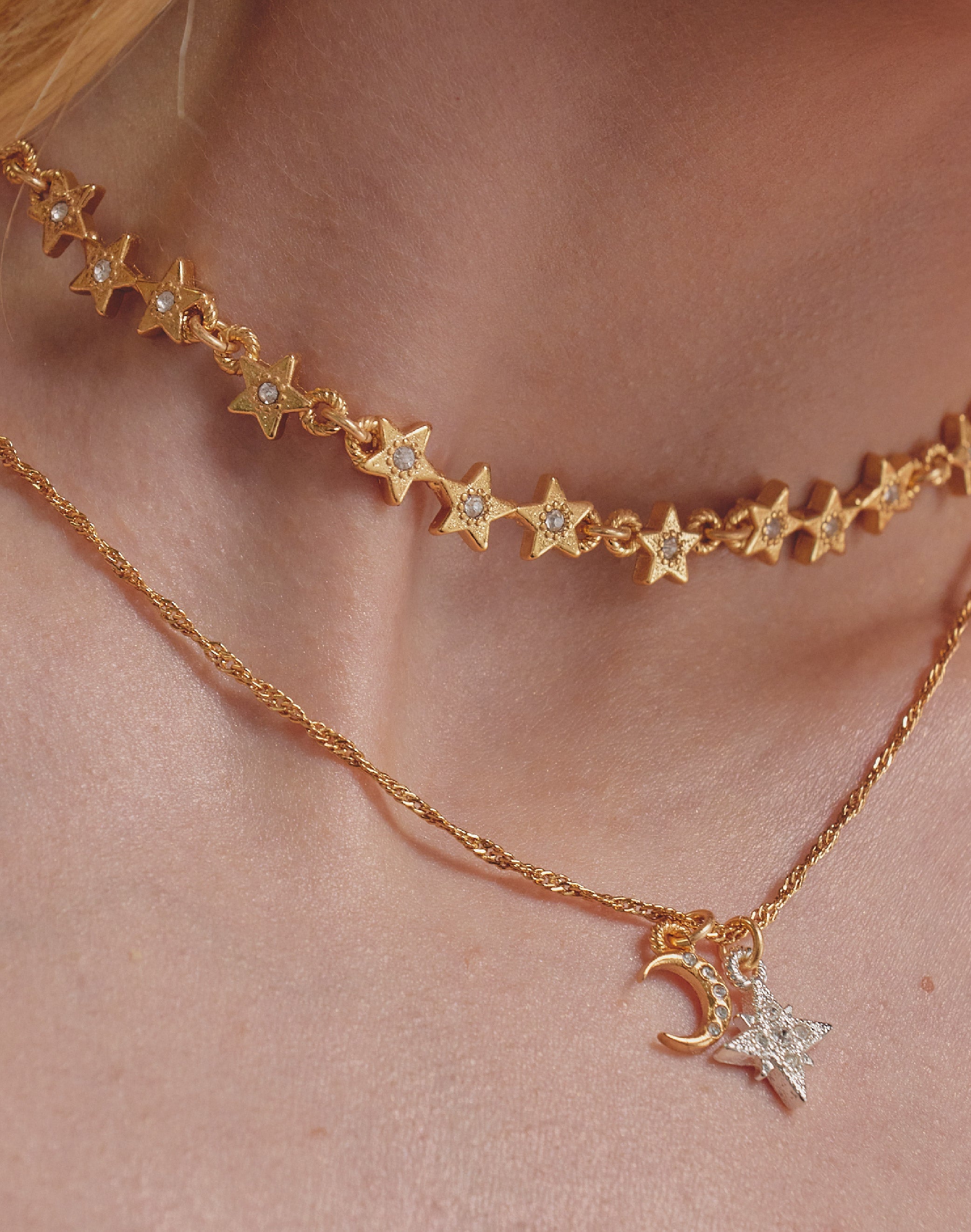 Combina un choker de estrellas delicado perfecto para un look minimalista, con una cadena versátil que lleva un dije de estrella y luna. Dos diseños en uno: elige usarlos juntos o por separado según tu vibe del día. Ideal para quien ama los accesorios que se adaptan a cualquier ocasión.